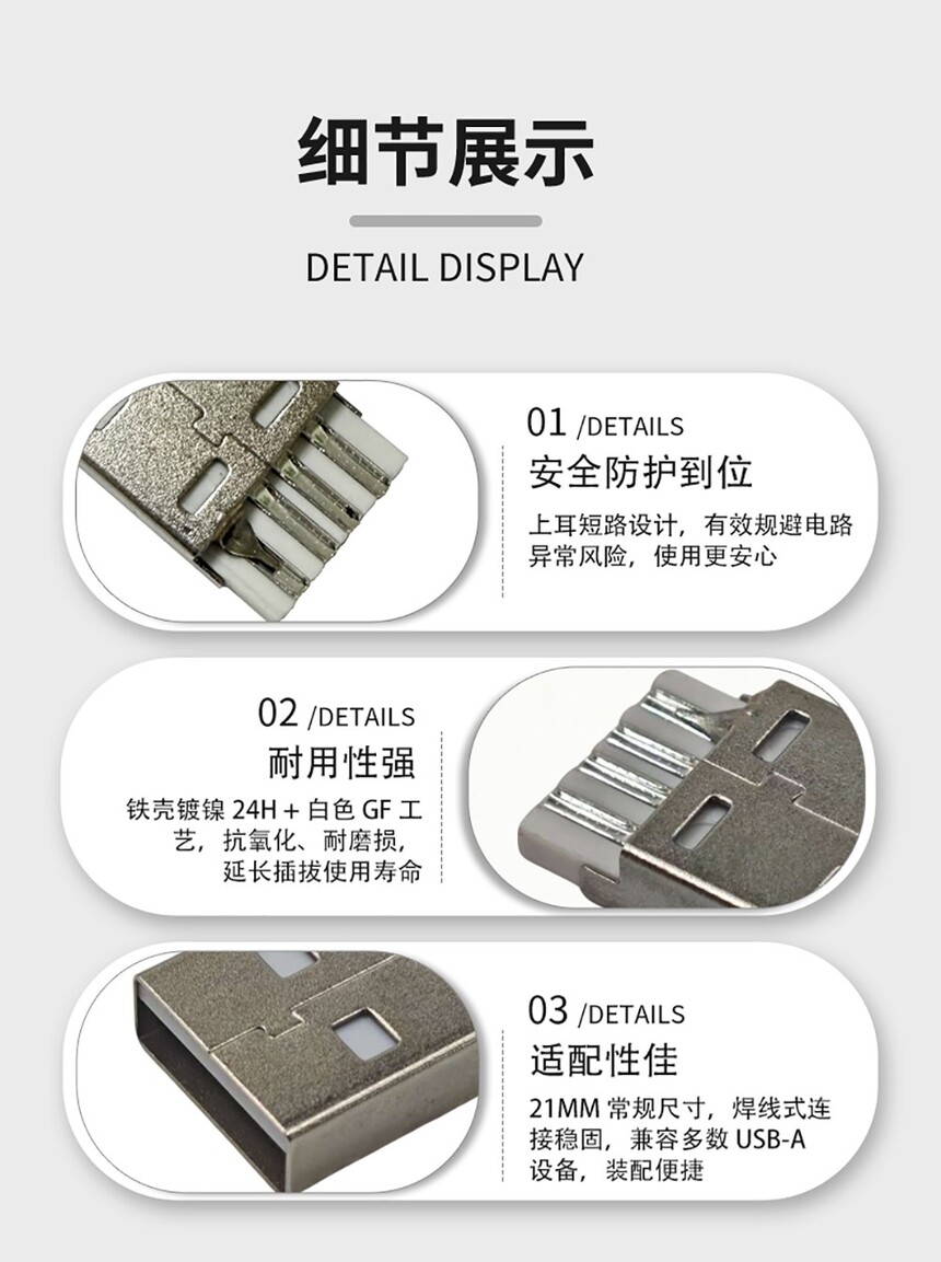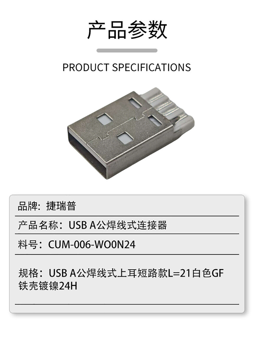 USB A公焊线式 上耳短路款L=21 白色G/F铁壳镀镍24H